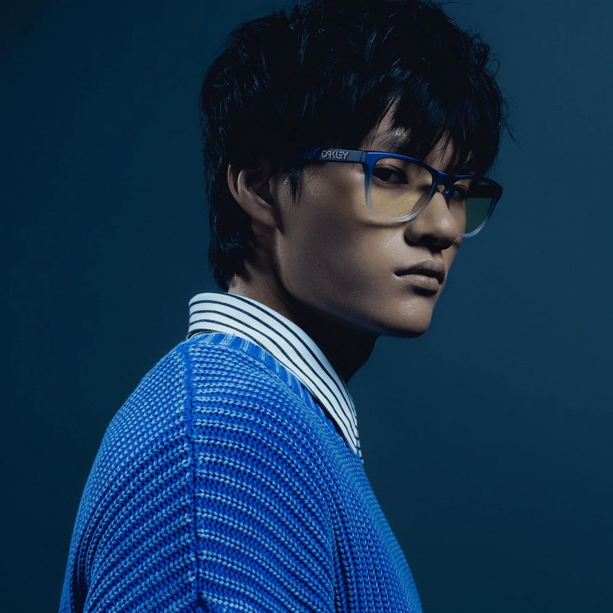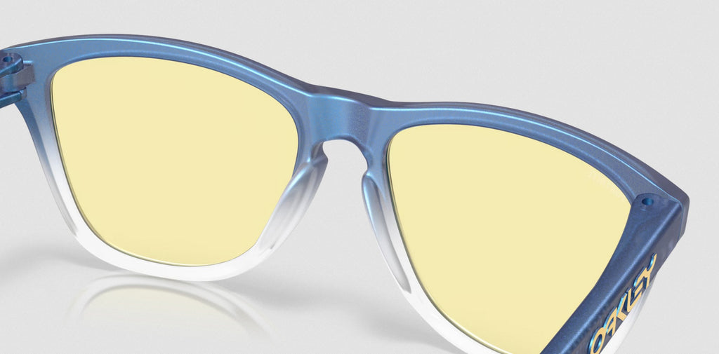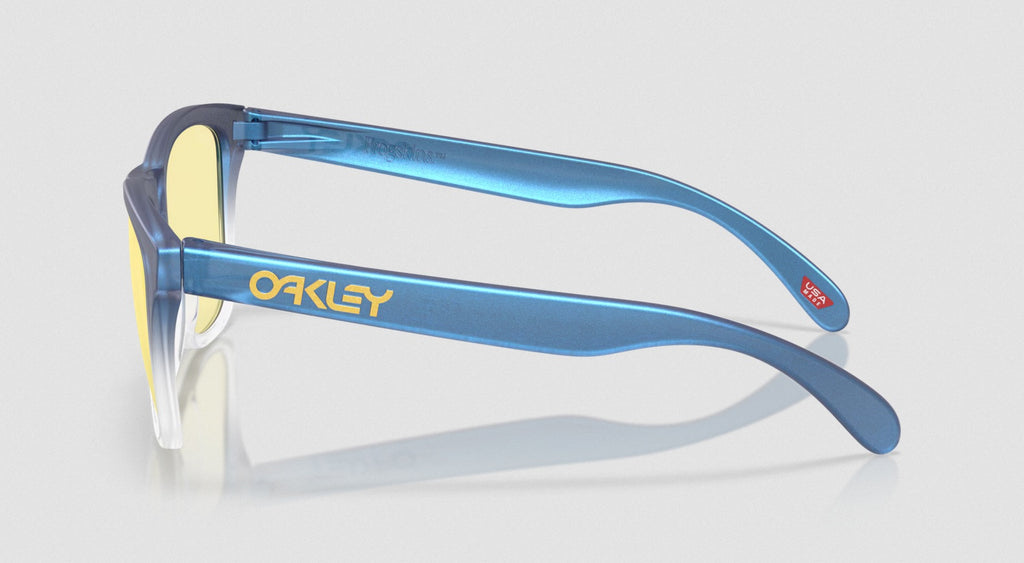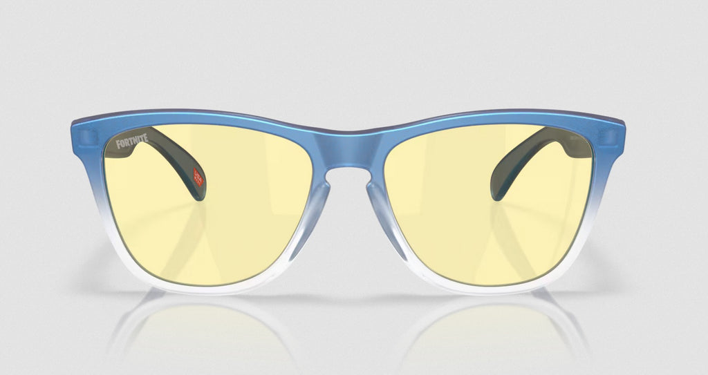 The Oakley X Fortnite Frogskins in Matte Cyan/Blue/Clear Shift Fade/Prizm Gaming 2.0